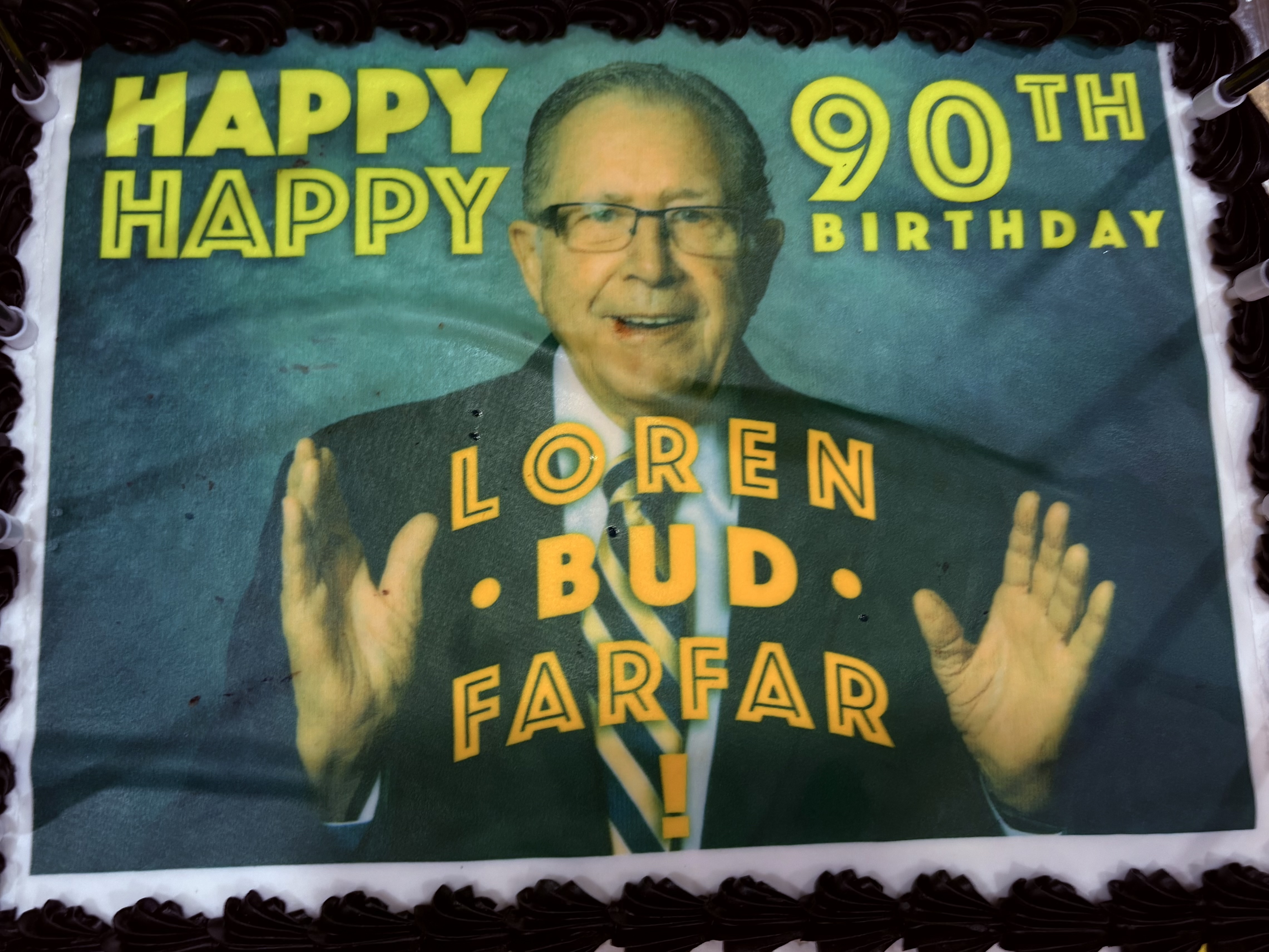 Loren Ekroth turned ninety on January 14, 2025. A family birthday cake, photographed and preserved, reads: “Happy Happy 90th Birthday Loren Bud Farfar!” The cake features a photo of Loren in a suit and glasses, hands raised mid-gesture — the pose of someone who spent a lifetime teaching communication.