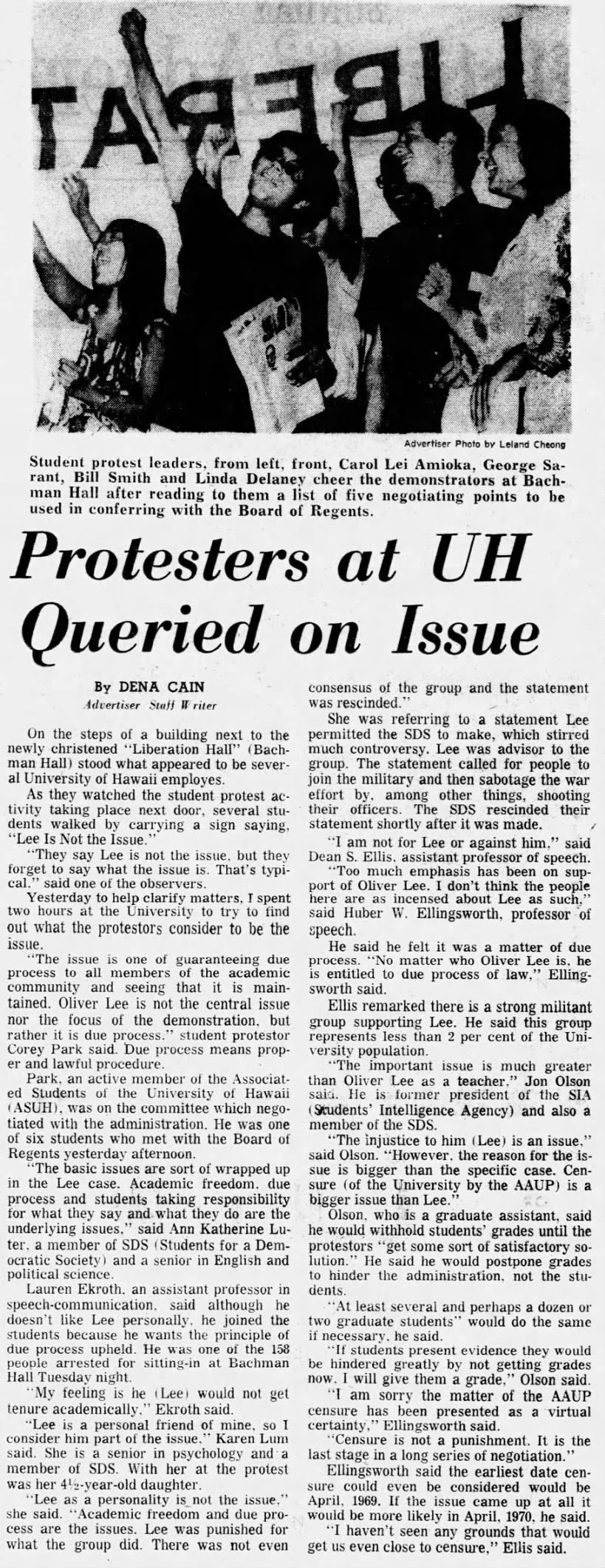 Five days later, the Honolulu Advertiser reported that Ekroth was among the faculty members questioned by a university committee about their participation in the sit-in. The professors issued a joint clarification defending their actions on the grounds of academic freedom.