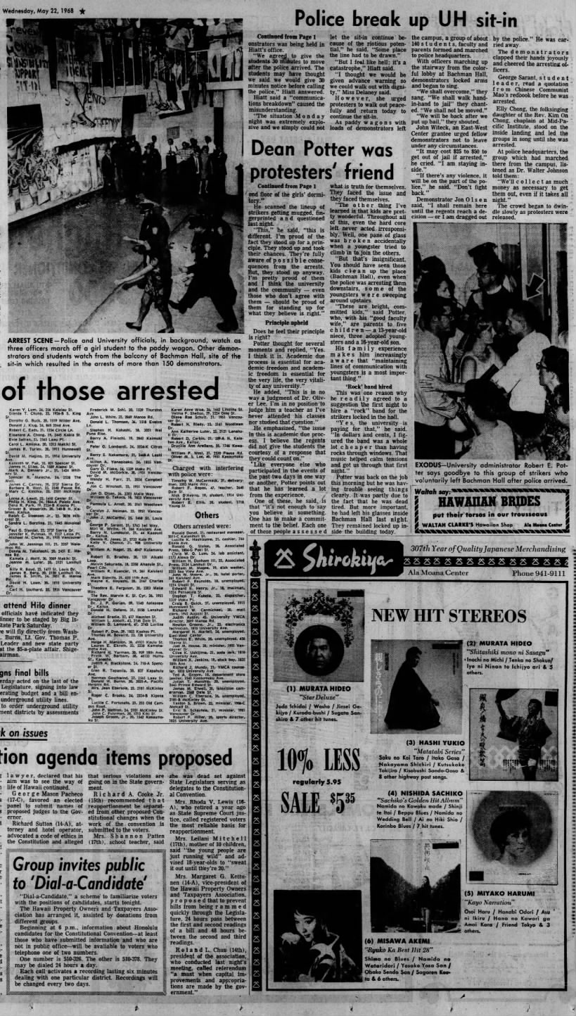 Four and a half years later, in November 1972, the Star-Bulletin’s Lois Taylor returned to the story in a two-page retrospective, “Whatever Happened to the Bachman Hall Gang?” Ekroth — still on the speech faculty — offered a reflective diagnosis of the movement’s decline: “It’s the sense of belonging that’s absent in a multiversity. The return to the fraternity thing tells you who you are. It is a reflection of a larger society, belonging to the bowling team and the Elks. Anger is the cement that holds a student movement together. Without anger there’s no sense of direction. The movement with all its craziness, its flailing out, was healthy to the extent that students and faculty were taking some real responsibility in the functioning of the university.” The 1972 article puts the arrest count at 152 rather than 158; the original 1968 Star-Bulletin reporting said 158. The discrepancy is unexplained.