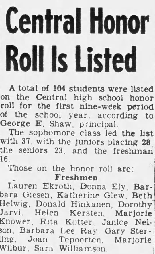 In the fall of 1948, Lauren Ekroth entered Central High School as a thirteen-year-old freshman and immediately distinguished himself academically. The Evening Telegram published the first-quarter honor roll on November 23, 1948: Lauren was one of only sixteen freshmen — in a school large enough to enroll 104 honor-roll students across four grades — to make the list. Principal George E. Shaw released the roll, which he would later describe as a source of school pride. His own self-description in a 2014 interview as “generally a very good student” is understated by the evidence.