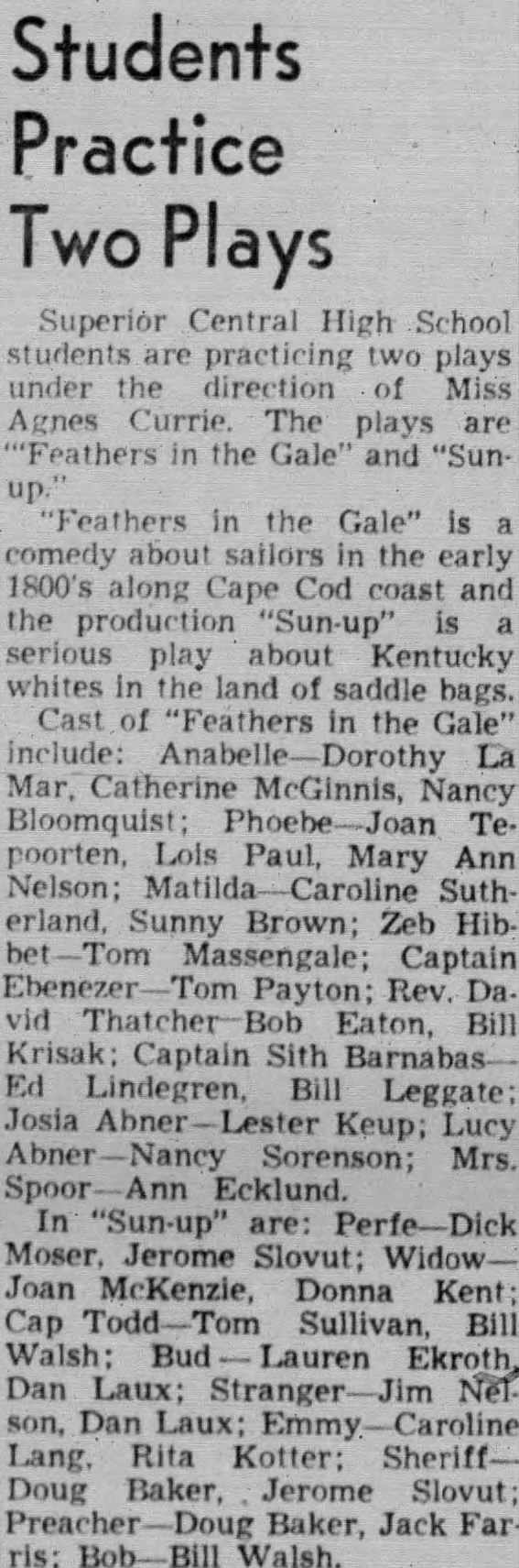 Three and a half years later, in February 1952, Lauren appeared in a second, very different kind of notice: the cast list for Central’s production of two plays under drama director Miss Agnes Currie. He was cast in the role of “Bud” in Sun-up, a serious folk drama by Lula Vollmer set among Appalachian mountain people during World War I. The part was double-cast with classmate Dan Laux, indicating multiple performance nights. This is the first documented evidence of the theatrical practice that would define his adult career — at seventeen, playing a substantial role in a play that demanded emotional depth and dialectal authenticity.
