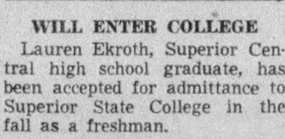 That spring, Lauren graduated with the class of 1952 and was accepted at Superior State College. The Evening Telegram published the notice in August: “Lauren Ekroth, Superior Central high school graduate, has been accepted for admittance to Superior State College in the fall as a freshman.” He did not take a gap year; he enrolled that fall at age seventeen, carrying with him an academic record and a first taste of the stage that would both expand rapidly in college.