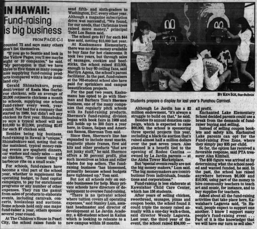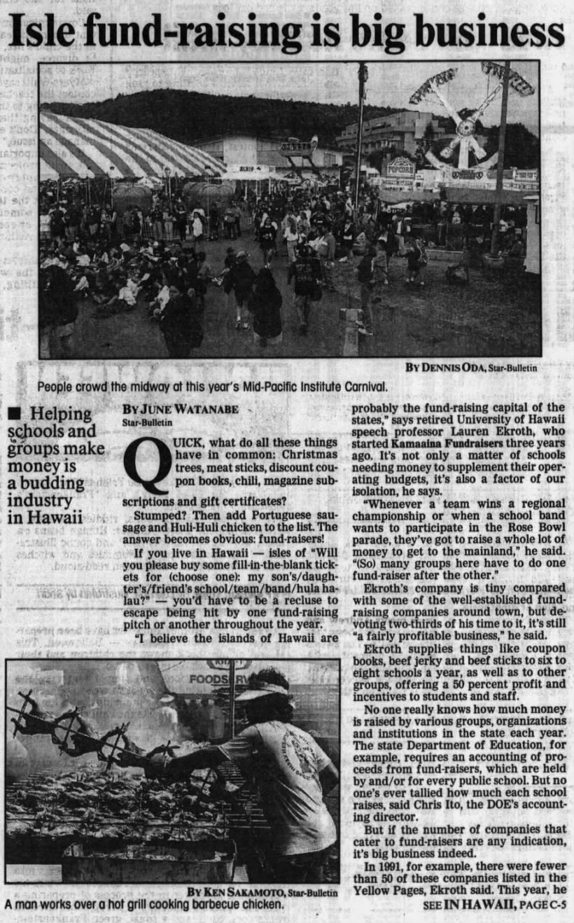 Ekroth offered a characteristically analytical take on the industry: “I believe the islands of Hawaii are probably the fund-raising capital of the states.” He explained the underlying logic — Hawaii’s geographic isolation meant that schools and teams needed far more money to travel to mainland competitions than their counterparts anywhere else. “Whenever a team wins a regional championship or when a school band wants to participate in the Rose Bowl parade, they’ve got to raise a whole lot of money to get to the mainland,” he said. He had counted 72 fundraising companies listed in the Honolulu Yellow Pages that year, up from fewer than 50 in 1991, estimating that Hawaii had three to five times the density of such companies as a comparable mainland city.