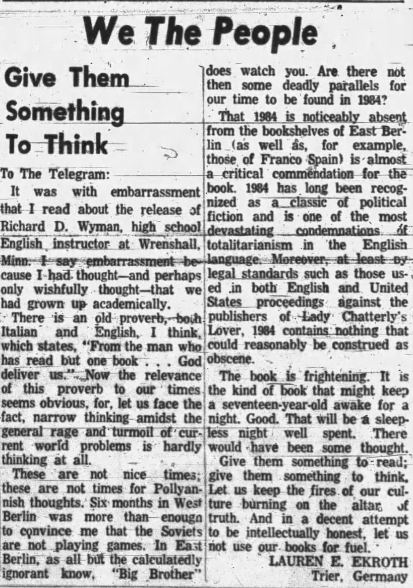The earliest known published writing by Loren Ekroth is a letter to the editor of the Evening Telegram, dateline Bitburg, Germany, printed October 31, 1961. He was writing in defense of Richard D. Wyman, a high school English instructor at Wrenshall, Minnesota, who had apparently been dismissed for assigning controversial books. Ekroth invoked his recent experience: “Six months in West Berlin was more than enough to convince me that the Soviets are not playing games. In West Berlin, as all but the calculatedly ignorant know, ‘Big Brother’ does watch you.” He drew parallels between the absence of Orwell’s 1984 from East Berlin bookshelves and the censoring impulse he saw at home, and defended D. H. Lawrence’s Lady Chatterley’s Lover on legal and literary grounds. The letter closed: “Give them something to read; let us keep the fires of our culture burning on the altar of truth.” The voice was earnest, impassioned, and grounded in firsthand Cold War observation. At twenty-six, writing home from a military base in Germany, his instinct was to argue in public for the freedom to think.