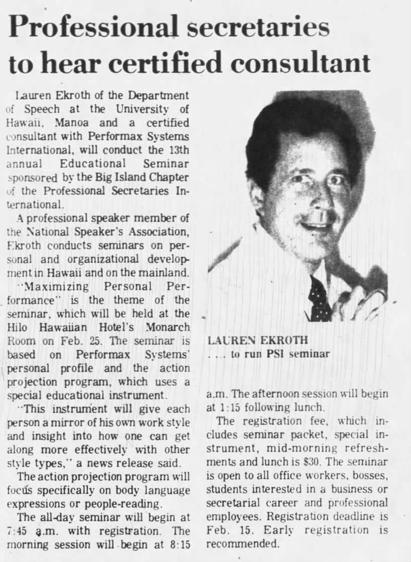 By February 1984, Lauren Ekroth held concurrent professional identities. The Hawaii Tribune-Herald identified him as a member of the Department of Speech at the University of Hawaii, Manoa — still a tenured professor — and as a certified consultant with Performax Systems International, as well as a professional speaker member of the National Speaker’s Association. The article previewed his role leading the 13th annual Educational Seminar of the Big Island Chapter of Professional Secretaries International, to be held February 25 at the Hilo Hawaiian Hotel’s Monarch Room.