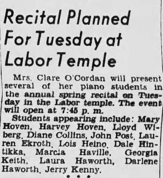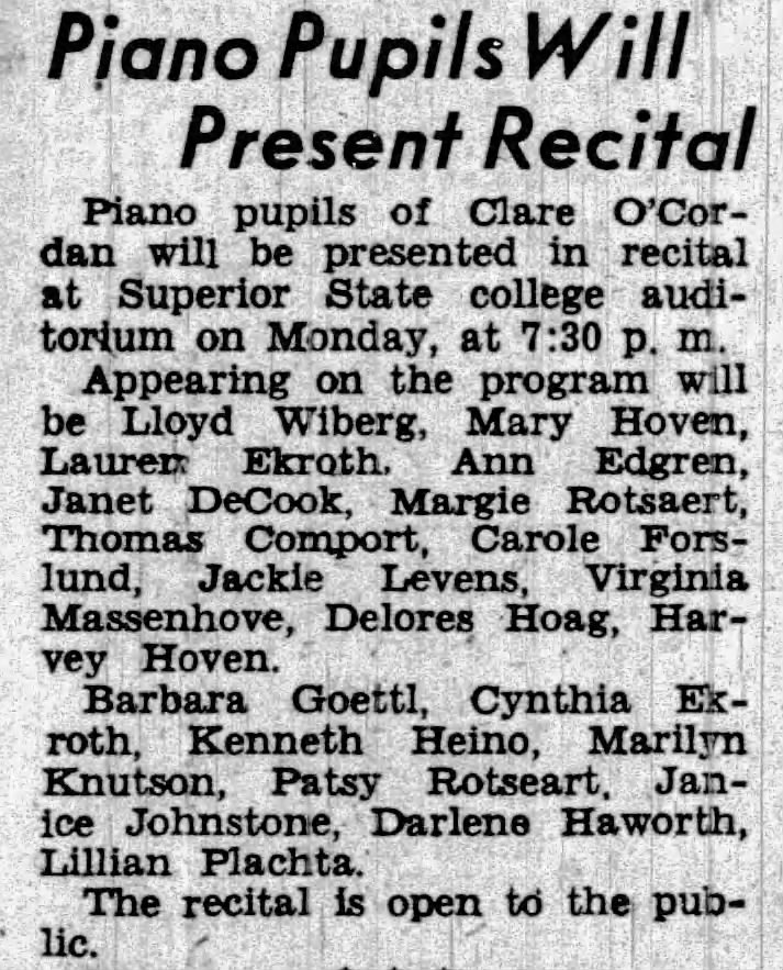 For at least two consecutive springs — May 1947 and May 1949 — Lauren Ekroth performed in the annual recitals of Superior piano teacher Clare O’Cordan. The first recital, announced in the Evening Telegram on May 24, 1947, was held at Superior State College auditorium; the second, on May 30, 1949, at the Labor Temple. Both were public events open to the community.